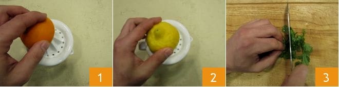 Pour préparer le sandwich cubain, commencez par préparer la marinade pour la viande : pressez un citron et une orange (1-2), en mettant le jus des deux dans un bol. Hachez finement la coriandre fraîche 3,