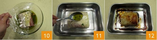 Disposez la longe dans le bol, couvrez-la de film transparent et laissez mariner entre 2 et 12 heures 10, en retournant la viande de temps en temps : plus vous prolongerez la marinade, plus votre viande sera savoureuse. Ensuite, placez-la dans un plat, arrosez-la légèrement avec une partie du liquide de la marinade 11 et faites cuire dans un four statique préchauffé à 180°C pendant 40-45 minutes (ou à 160°C pendant 35-45 minutes). Lorsque la viande est cuite, sortez-la du four et laissez-la refroidir complètement 12.