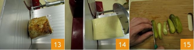 Coupez la longe et l'Edamer en tranches fines, en vous aidant avec une trancheuse (13-14) (alternativement, vous pouvez la couper à la main, en essayant de faire des tranches les plus fines possible), puis coupez également les cornichons en tranches de 3-4 mm d'épaisseur dans le sens de la longueur 15.