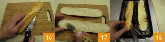 Avec un couteau à scie, divisez la baguette en deux 16, puis badigeonnez la mie avec le beurre fondu des deux côtés 17. Mettez à chauffer une grille ou une plaque sur le feu, puis faites griller la baguette pendant 2 minutes, en la retournant des deux côtés 18.