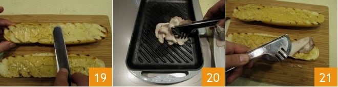 Étalez la moutarde des deux côtés 19, puis grillez légèrement les tranches de longe pour quelques instants 20. À ce stade, vous pouvez procéder à la composition du sandwich : disposez les tranches de longe 21,