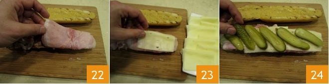puis le jambon cuit 22, le fromage en tranches 23 et enfin les cornichons, en les distribuant les uns à côté des autres 24.