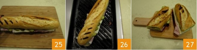Fermez le sandwich 25, passez-le à nouveau sur la plaque chaude 2 minutes de chaque côté, pour le rendre croustillant et faire fondre le fromage. Une fois prêt 26, coupez chaque sandwich cubain en deux et servez 27.