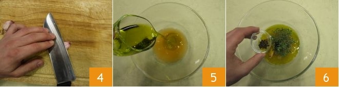 écrasez l'ail avec le dos d'un couteau 4, puis dans le bol avec le jus des agrumes, versez l'huile 5 avec la coriandre hachée et les gousses d'ail. Ajoutez le poivre noir 6,