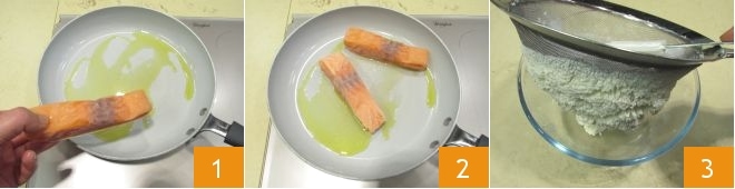 Pour préparer le saumon caramélisé au miel, commencez par mettre une poêle avec un filet d'huile sur le feu, ajoutez les filets de saumon 1 et faites-les cuire à feu moyen-élevé pendant 10 minutes, sans les retourner 2. Pendant ce temps, tamisez la ricotta dans un bol à part, en vous aidant d'une spatule et d'une passoire 3;