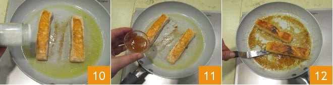salez 10, poivrez, baissez le feu et faites cuire à feu doux pendant encore 2-3 minutes. Ensuite, versez le miel dans la poêle 11 et faites cuire encore environ 2 minutes. À ce stade, retirez délicatement les filets de saumon de la poêle, en conservant le jus de cuisson 12,