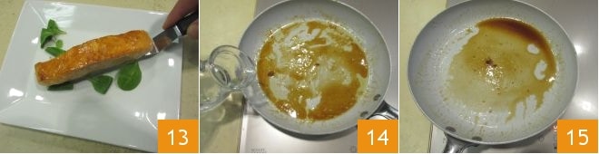 et transférez-les sur le plat de service, sur lequel vous aurez disposé quelques feuilles de mâche 13. Maintenant, déglacez le fond de cuisson en versant une louche d'eau dans la poêle où vous avez cuit le saumon 14 et portez-la à ébullition en remuant jusqu'à ce qu'elle épaississe, afin de former une petite sauce 15.