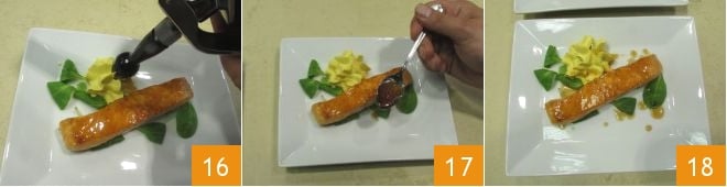 Pour servir, ajoutez une cuillerée de mousse de ricotta à côté du saumon 16 et saupoudrez d'une cuillère à café du fond de cuisson 17 : votre saumon caramélisé au miel est prêt à être dégusté 18 !