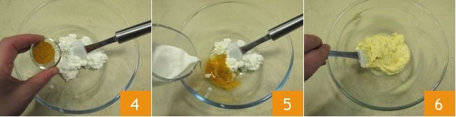 ajoutez à la ricotta le curcuma en poudre 4 et la crème fraîche liquide 5, salez à votre goût et mélangez avec une spatule pour bien amalgamer le tout 6.