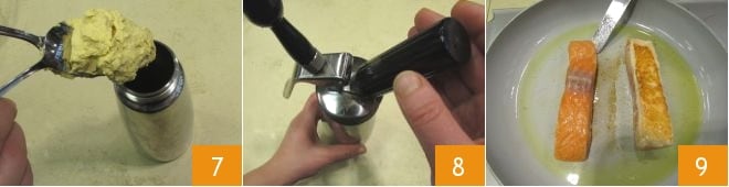 Transférez le mélange de ricotta dans un siphon 7, vissez le capuchon 8 et insérez le gaz à l'intérieur, puis agitez énergiquement. Après les 10 minutes de cuisson, tournez délicatement les filets de saumon avec une spatule 9,