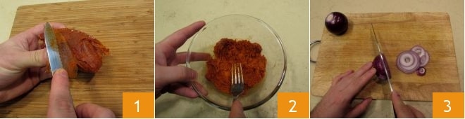 Pour préparer les scialatielli avec la nduja, enlevez le boyau de la nduja 1 et placez-la dans un bol, en l'écrasant avec une fourchette pour l'assouplir 2. Coupez l'oignon en rondelles 3