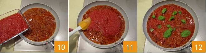Ajoutez également la pulpe de tomate 10 et laissez cuire à feu modéré pendant 15 minutes 11, puis terminez en ajoutant quelques feuilles de basilic 12.
