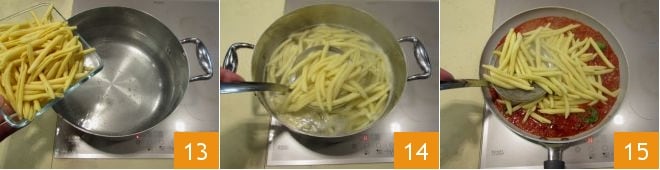Mettez une casserole d'eau salée abondante sur le feu et portez-la à ébullition. Faites cuire les scialatielli pendant 11 minutes 13, en les laissant al dente, puis égouttez-les 14, ajoutez-les directement dans la garniture que vous avez préparée 15 et mélangez pour les assaisonner.
