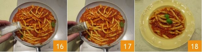 Sauter le tout pendant quelques instants et ajustez le sel 16 et le poivre 17, puis servez vos scialatielli avec la nduja bien chauds 18.