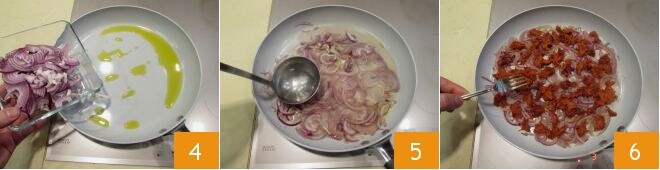 et faites-le revenir à feu doux pendant 6 minutes dans une poêle antiadhésive avec l'huile 4, en versant 50 g d'eau chaude 5. Ensuite, ajoutez la nduja en petits morceaux, en la répartissant uniformément 6.