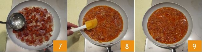 Versez l'eau chaude restante 7 et mélangez avec une spatule de cuisine 8 pour que la nduja se dissolve 9.