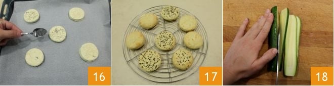 et placez-les sur une plaque de cuisson recouverte de papier cuisson. Saupoudrez-en certains de graines de sésame blanches, d'autres de graines noires et les restants de graines de pavot 16. Placez la plaque au réfrigérateur pour laisser reposer les disques encore 10-15 minutes, avant de les enfourner dans un four statique préchauffé à 200°C pendant environ 15-20 minutes (180°C pendant 10-15 minutes si four ventilé). Une fois cuits, ils doivent être dorés en surface (vous pouvez vérifier la cuisson en les piquant avec un cure-dent : s'il en ressort sec, ils seront cuits) ; vous pourrez les sortir du four et les laisser refroidir complètement sur une grille. Pendant ce temps, pour la garniture, lavez et équeutez une courgette, puis coupez-la en tranches assez fines avec un couteau 18 ou une mandoline.