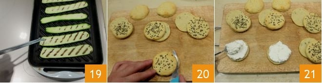 Faites chauffer très bien la plaque et grillez les courgettes des deux côtés 19 ; puis, lorsque les scones sont froids, ouvrez-les en deux dans le sens de la largeur avec un petit couteau 20 et garnissez 6 moitiés avec de la ricotta 21,