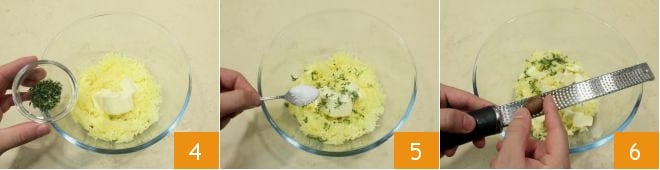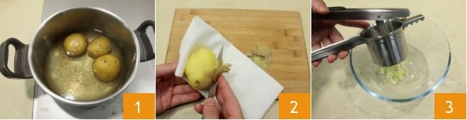 Pour préparer les scones salés aux pommes de terre, commencez par ces dernières : lavez-les sous l'eau courante, puis mettez-les à cuire dans une grande casserole avec beaucoup d'eau légèrement salée 1 : il faudra environ 30 minutes de cuisson pour qu'elles soient tendres (vous pouvez réduire le temps en utilisant une cocotte-minute, il faudra environ 12 minutes dans ce cas) ; une fois cuites, épluchez-les encore chaudes 2 et écrasez-les dans un bol 3.