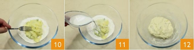 Lorsque le mélange de pommes de terre est froid, versez-le dans le bol avec la farine et la levure 10 et ajoutez également le lait petit à petit 11, puis mélangez tous les ingrédients : vous devez obtenir une pâte compacte et homogène. Ensuite, formez une boule de pâte 12 et placez-la au réfrigérateur pour raffermir couvert d'un film plastique pendant environ 20 minutes.
