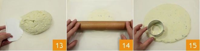Passé ce temps, renversez la pâte sur un plan de travail légèrement fariné, posez une feuille de papier cuisson dessus et étalez la pâte en un disque de 1,5 cm d'épaisseur 14 ; ensuite, retirez la feuille de papier cuisson et avec un emporte-pièce de 6,5 cm de diamètre, réalisez 12 disques 15