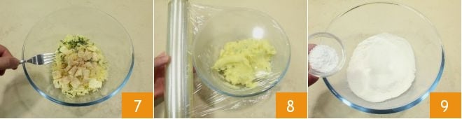 mélangez le tout avec une fourchette 7, puis couvrez avec un film plastique et laissez refroidir à température ambiante, puis au réfrigérateur 8. Ensuite, dans un bol, tamisez la farine et ajoutez la levure pour préparations salées 9.