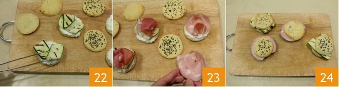 puis disposez sur les moitiés avec la ricotta les courgettes grillées 22 ou le jambon cru ou la mortadelle 23 ; refermez-les avec les autres moitiés et vos scones salés aux pommes de terre sont prêts à être dégustés 24 !