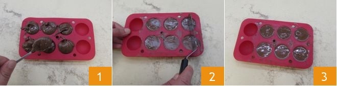 Pour préparer le semifreddo à la pistache et Nutella, commencez par réaliser le cœur de Nutella. Prenez le moule en silicone en forme de demi-sphère et, à l'aide d'une cuillère, remplissez-le de Nutella 1. Nivelez bien avec une spatule 2, jusqu'à nettoyer toute la surface du moule 3. Couvrez avec du film alimentaire et placez au congélateur pendant au moins 2 heures. De cette façon, vous obtiendrez 6 demi-sphères de Nutella de 25 grammes chacune.