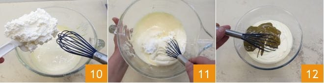 À ce stade, incorporez la crème fouettée au mélange des jaunes d'œufs 10, en mélangeant délicatement avec un fouet, sans faire retomber le mélange 11. Versez également la pâte de pistaches, après l'avoir mélangée, et, en utilisant toujours un fouet, amalgamez le tout 12.