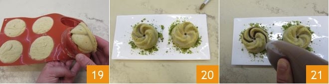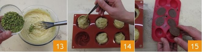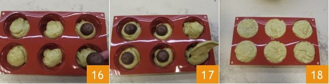 Insérez donc les sphères de Nutella au centre de chaque moule 16. Recouvrez avec le semifreddo à la pistache jusqu'à remplir complètement la forme 17 et nivelez bien la surface 18 avec une spatule. Placez votre semifreddo pistache et Nutella au congélateur pendant au moins une nuit.