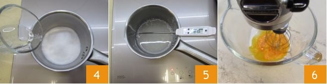 Après 1 heure et demie, procédez à la préparation du semifreddo. Mettez le sucre dans une casserole à fond épais et ajoutez également l'eau 4, puis placez-le sur le feu et portez le sirop à 121°C 5 (utilisez un thermomètre de cuisine pour mesurer la bonne température). Pendant ce temps, mettez les jaunes d'œufs dans le bol d'un batteur et commencez à les monter 6 uniquement lorsque votre sirop aura presque atteint la température indiquée.