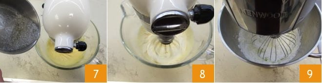 Une fois que le sirop aura atteint 121°C, versez-le en filet dans le batteur en marche 7 et continuez à battre jusqu'à ce que le mélange refroidisse complètement 8. Pendant ce temps, montez également la crème fraîche en chantilly 9.
