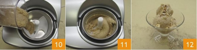 Après ce temps, versez le mélange bien froid dans la sorbetière 10 et mettez-la en marche jusqu'à obtenir la consistance désirée 11; cela prendra environ une heure mais le temps peut varier selon le modèle de sorbetière utilisé. Transférez le sorbet dans un verre à dessert et garnissez de praliné de noisettes, ensuite, votre délicieux sorbet aux noisettes est prêt à être servi 12 !
