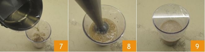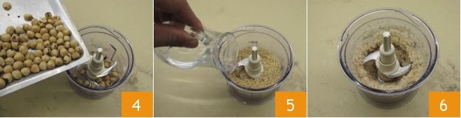 Une fois grillées, laissez-les tiédir ; transférez les noisettes dans un mixeur 4 et hachez-les grossièrement. Ensuite, ajoutez dans le mixeur les autres 200 g d'eau 5 et continuez à mixer jusqu'à obtenir une crème homogène 6.