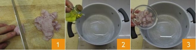 Pour préparer la soupe au chou frisé, commencez par éplucher et trancher finement l'échalote 1. Dans une grande casserole, chauffez l'huile d'olive 2, puis ajoutez l'échalote 3 et laissez-la mijoter à feu doux pendant 5 minutes.
