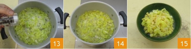 Vers la fin de la cuisson, poivrez à votre goût 13, puis éteignez le feu 14 et servez immédiatement votre soupe au chou frisé bien chaude 15.