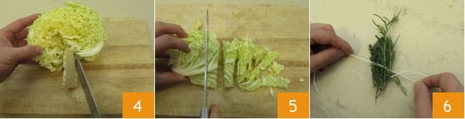 Pendant ce temps, prenez le chou frisé, éliminez la côte centrale plus dure 4, puis coupez-le en lanières 5. Lavez le chou frisé sous l'eau courante et laissez-le égoutter de côté. Entre-temps, rassemblez les brindilles de thym, de romarin et les feuilles de laurier et attachez-les avec de la ficelle 6, ainsi il sera plus facile de les retirer de la casserole à la fin de la cuisson.