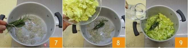 Lorsque l'échalote est bien mijotée, ajoutez le bouquet d'aromates 7 et le chou frisé 8, laissez mijoter à feu moyen pendant 5 minutes, puis versez l'eau 9
