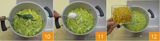 Retirez les aromates avec une pince de cuisine 10, salez 11 et portez l'eau à ébullition. Lorsque l'eau commence à bouillir, ajoutez les pâtes 12 et faites-les cuire pendant 10 minutes ou selon le temps indiqué sur l'emballage.