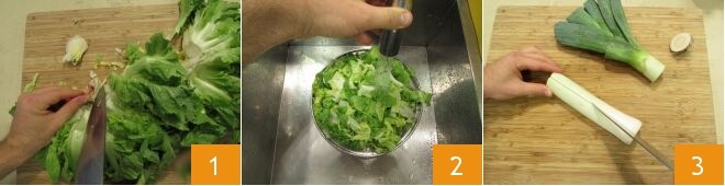 Pour préparer la soupe de scaroles et pommes de terre, commencez par réaliser le bouillon de légumes, puis passez au nettoyage des légumes. Divisez la scarole en deux, éliminez le pied 1 et coupez-la en lanières d'environ 3-4 cm. Lavez-la sous l'eau courante 2 et réservez. Passez au poireau, éliminez la partie verte et faites une incision verticale 3 pour pouvoir éliminer facilement la première couche.
