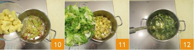 et ajoutez les pommes de terre 10. Laissez-les s'imprégner quelques instants, puis ajoutez également la scarole 11. Ajoutez abondamment de bouillon 12 jusqu'à recouvrir le tout.