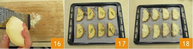 Entre-temps, râpez le caciocavallo 16 et dès que les croûtons sont légèrement dorés 17, utilisez-le pour les recouvrir 18. Remettez au four pour 2-3 minutes supplémentaires,