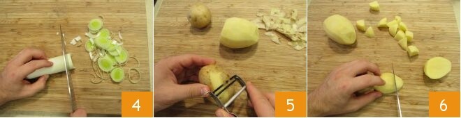 Coupez-le ensuite en rondelles 4 et passez aux pommes de terre. Épluchez-les 5 et coupez-les en cubes d'environ 2-3 cm 6.