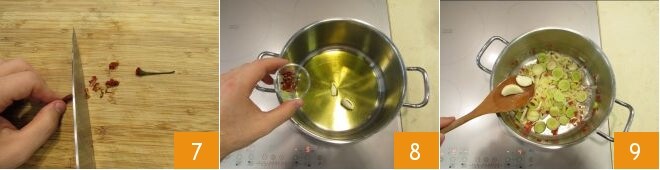 Enfin, hachez aussi le piment 7. Versez maintenant un filet d'huile dans une casserole, ajoutez les gousses d'ail et le piment 8; faites chauffer et ajoutez également le poireau. Laissez-le mijoter pendant environ 4-5 minutes en remuant de temps en temps, puis éliminez l'ail 9