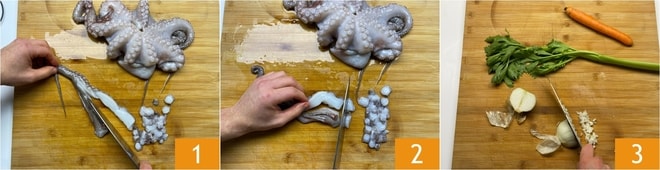 Pour préparer les spaghetti à la guitare avec ragoût de poulpe, assurez-vous d'abord que le poulpe est bien nettoyé, sans yeux ni bec. À ce stade, séparez les tentacules et divisez-les en deux 1, puis coupez-les pour obtenir des morceaux d'environ un demi cm 2. Préparez les légumes pour le soffritto, réalisez une fine hachure de carotte, céleri et oignon 3.