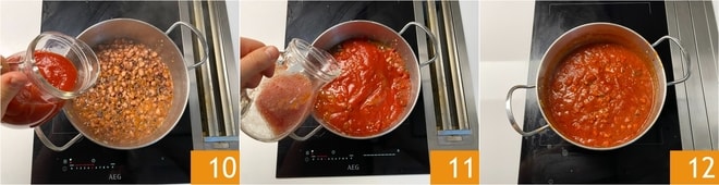 Dès que l'alcool est évaporé, ajoutez également la purée de tomates 10. Rincez ensuite le pichet avec de l'eau et versez-la dans la casserole 11. Ajoutez juste une pincée de sel et faites cuire pendant 40 minutes, jusqu'à ce que le poulpe soit tendre. Vous pouvez ajouter de l'eau si la sauce devait rétrécir et prolonger la cuisson.