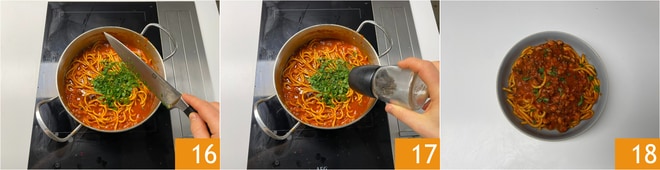 Faites cuire les spaghetti à la guitare dans une grande quantité d'eau bouillante salée, égouttez-les et transférez-les dans la sauce 13. Ajoutez un peu d'eau de cuisson 14 et un filet d'huile 15.