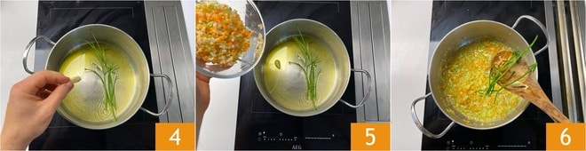 Séparez les tiges des feuilles de persil et hachez ces dernières. Réservez-les, en les couvrant d'un torchon humide. Dans une grande casserole, versez un filet d'huile, ajoutez les tiges de persil et la gousse d'ail 4. Allumez le feu et ajoutez également la hachure tout juste préparée 5. Laissez prendre goût et dès que le soffritto est bien fondu, retirez à la fois les tiges de persil et l'ail 6.