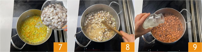 Versez ensuite les morceaux de poulpe 7 et mélangez. Faites cuire quelques minutes 8 et dès que l'eau est évaporée, déglacez avec le vin blanc 9.