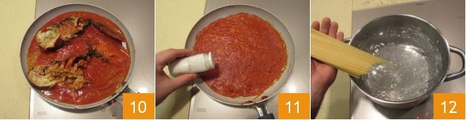 Quand les langoustes seront prêtes, retirez-les du feu et mettez-les sur une planche à découper 10 ; prolongez la cuisson de la sauce tomate de 15 minutes supplémentaires, en ajustant le sel et le poivre 11. Pendant ce temps, mettez sur le feu une casserole avec beaucoup d'eau salée qui vous servira pour la cuisson des pâtes. Quand l'eau frôlera l'ébullition, faites cuire les spaghetti al dente 12.